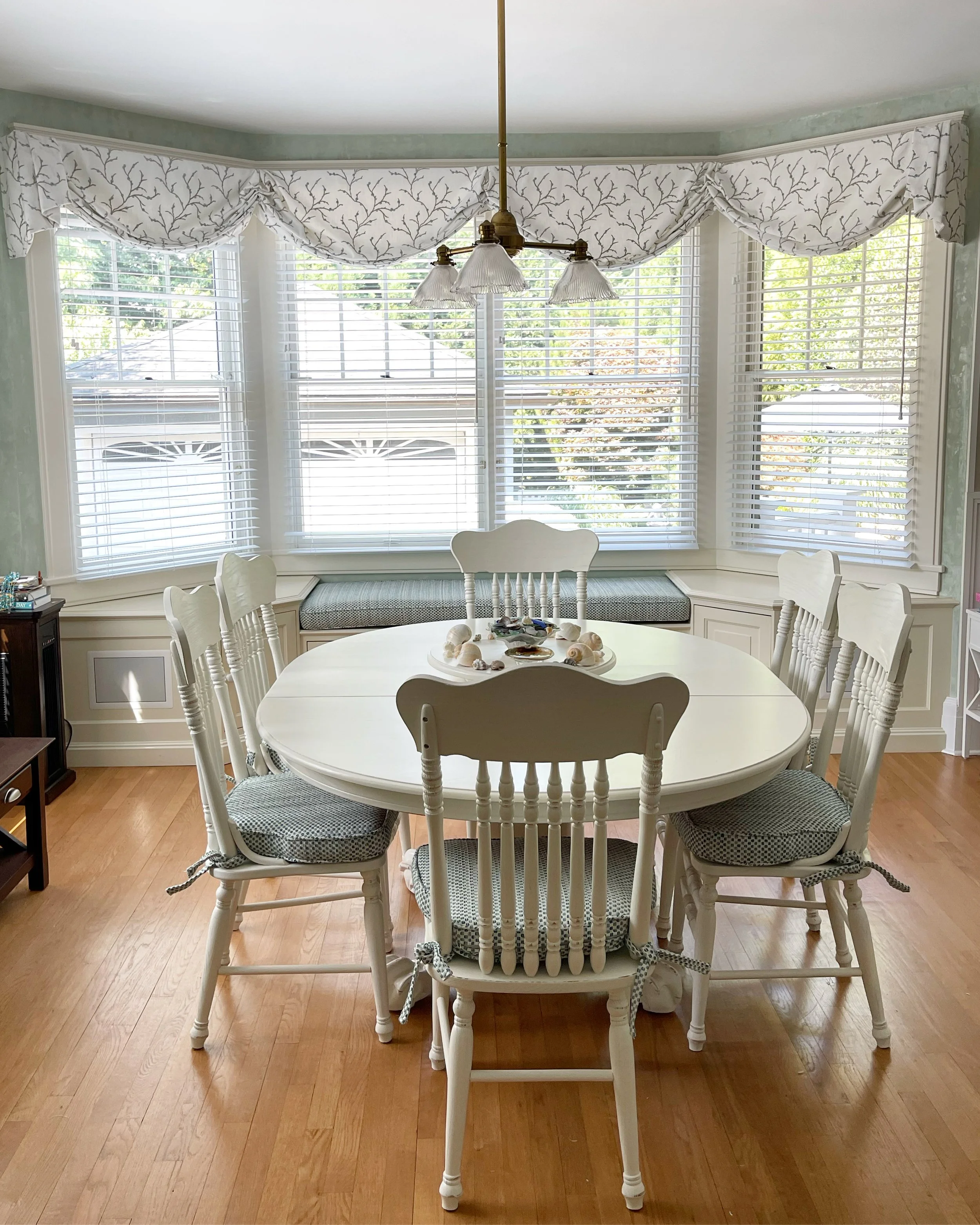 This light-filled dining nook in Red Bank received a graceful refresh grounded in comfort, craftsmanship, and a soft traditional sensibility. We refinished the existing table and chairs in a fresh, creamy white for a clean and cohesive look, while custom chair cushions in a soft woven pattern introduced texture and charm. The bay window was outfitted with tailored valances and layered treatments to frame the natural light and add a classic softness.